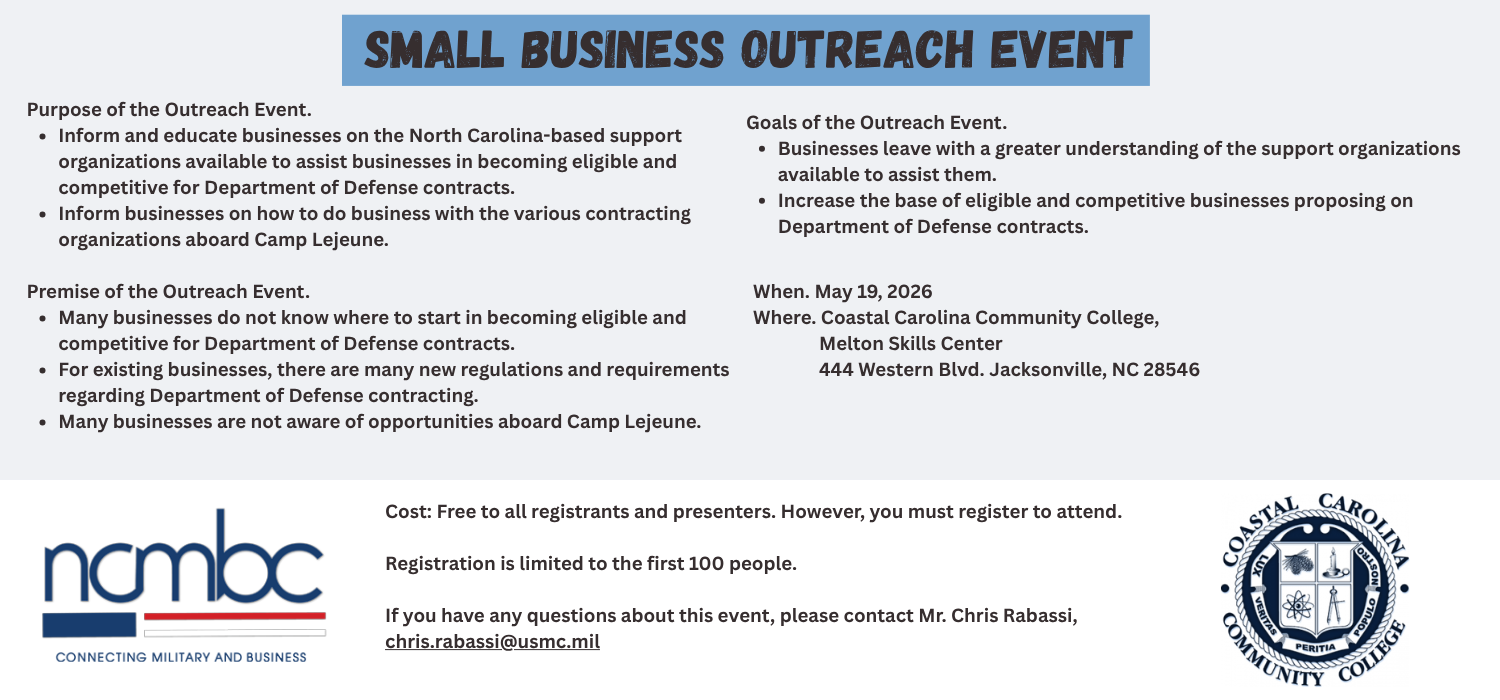 - Inform businesses on how to do business with the various contracting organizations aboard Camp Lejeune.